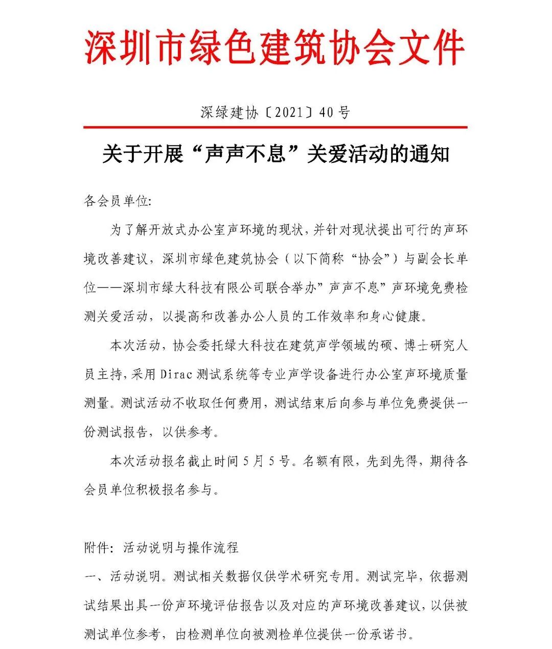 为了解开放式办公室声环境的现状,并针对现状提出可行的声环境改善建议,深圳市绿色建筑协会(以下简称“协会”)与副会长单位——深圳市绿大科技有限公司联合举办“声声不息”声环境免费检测关爱活动,以提高和改善办公人员的工作效率和身心健康。