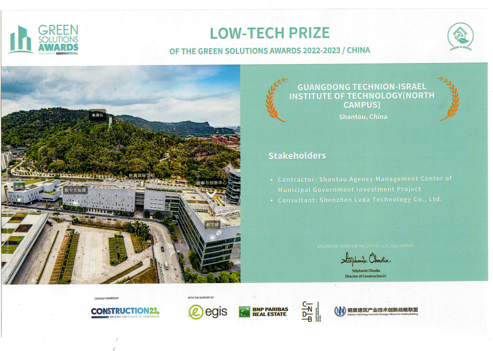 广东以色列理工学院是我国第一所引进以色列优质高等教育资源的中外合作大学,项目以全过程绿色建筑设计为手段,以国家绿色建筑三星级为目标,通过十年的努力,从项目选址、建筑设计、设备选型、材料甄选、施工管理及运营管理各个阶段进行了专业而严格的控制,为全校师生提供一座绿色校园。为记录总结这一项目的设计、建设及运营经验,项目出版了《绿色校园——广东以色列理工学院(北校区)建设纪实》。